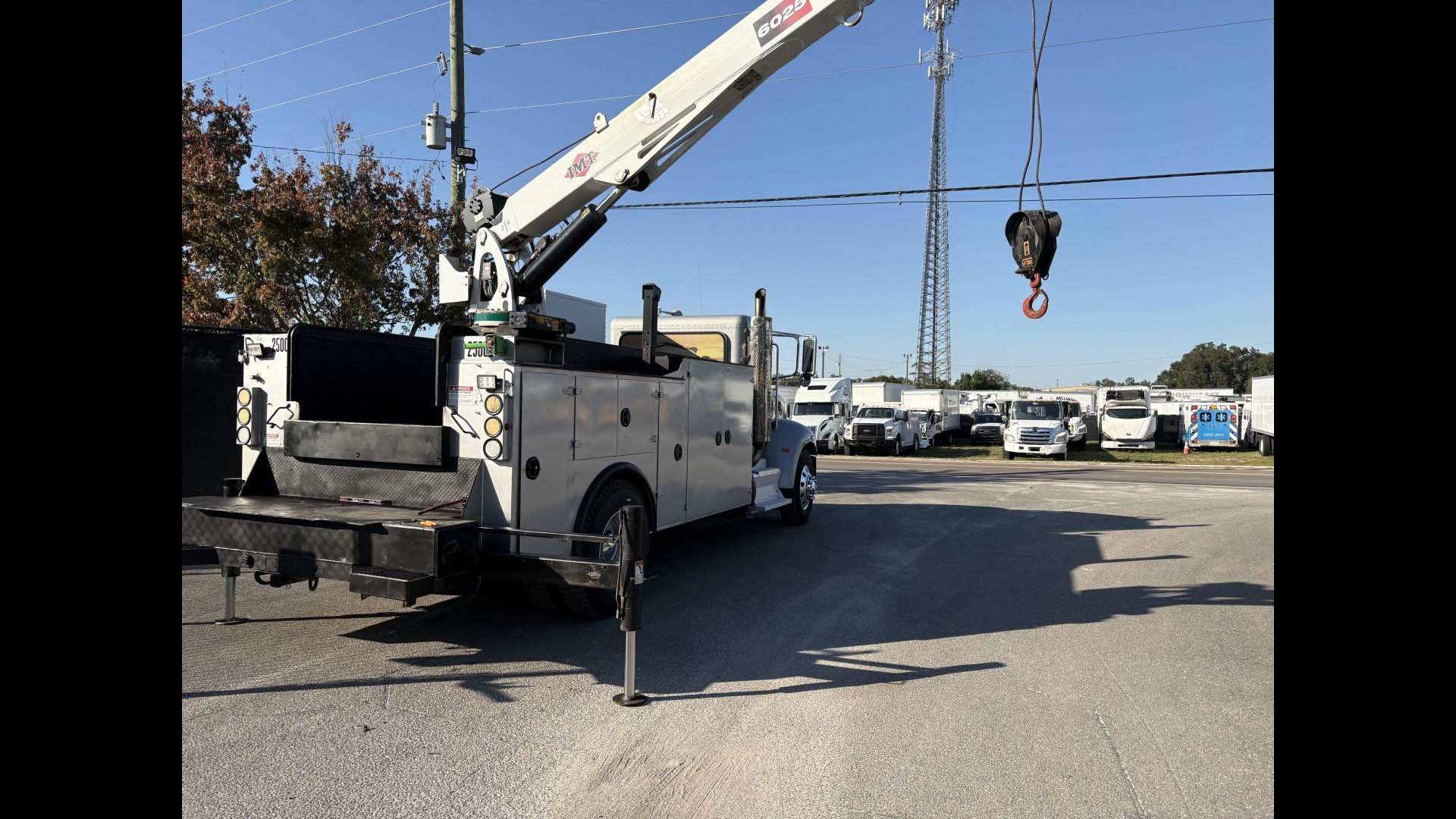 Odom Reads 292,341 miles, pwd by Paccar 8.3L  Eaton Mid-Range Synchro 6-speed manual transmission. Equipped with: IMT 6025 crane boom, mechanics body w/ cargo compartments, 14,000 lb lift capacity, hose reel, IMT compressed air system, two rear hydraulic stabilizers.